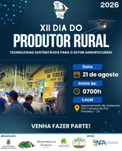 No dia 21 de agosto de 2026 acontecerá no Departamento de Zootecnia (DZ) da Universidade Federal do Ceará (UFC), o XII Dia do Produtor Rural, ação de extensão promovida pela Empresa Júnior de Zootecnia (EMZOOTEC Jr.) juntamente com o Núcleo de Ensino e Estudos em Forragicultura (NEEF), ambos pertencentes à UFC, que visa a ampliar o processo de difusão de tecnologias e aumentar o intercâmbio de informações entre entidades públicas/privadas atuantes no cenário da agropecuária regional e os produtores da região, de modo a contribuir com o aprimoramento das propriedades rurais e fortalecer o agronegócio no Nordeste do Brasil.